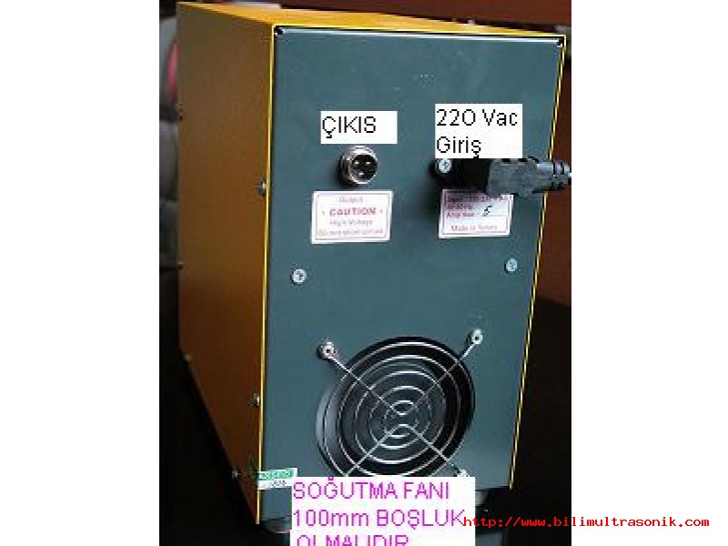 TEKNİK ÖZELLİKLER :Yanyana montajda iki jeneratör arasında mutlaka 5cm havalandırma boşluğu bırakılmalıdır .Aynı şekilde bir dolapta konumlanıyorsa önde ve arkada 10ar cm minumum boşluk bırakılmalı ve ortam sıcaklığı 30-35 C derecenin üzerine çıkıyorsa mutlaka ilave aspiratör veye klima ile ısı düşürülmelidir.Asitik veya korozyona sebep olucak nemli hava şartlarından jeneratör korunmalı girişi yeteri kadar geniş filtre ile metal ve aşındırıcı partiküller havadan süzülmeli ve bu hava şartlarında da sirkülasyonu ve soğutmayı sağlamak için uygun vantilatör kullanılmalıdır ULTRASONİK DALGA ÜRETİMİ (JENERATÖRÜ) FREKANS :ÜRETİCİ TARAFINDAN SİPARİŞTE AYARLANAN 15-25-28-36-40 KHZ (önceden haber verilerek farklı frekanslarda üretiyoruz) Bazı müşterilerimiz niye bazı üreticiler gibi kademesiz ayarlanmıyor diyor .Fakat bu kademesiz uygulamaların kullananların jeneratörle transducerların uyumsuz çalışması ,jeneratörün korumaya geçmesi gibi hatalara sebep olduğunu ,frekansı bilinmeyen transducerların çok verimsiz çalışmasına neden olduğunu gördük. ÇALIŞMA VOLTAJI :190-230 Volt ac 50Hz Flaş (Voltaj ani düşüp kalkan şebekelerde ) mikroişlemci korumaya geçer.Mutlaka bağlanılan makina ve jeneratör topraklı olmalı topraklı monofaze bir prize bağlanmalıdır ÇALIŞMA AKIMI :5 AMP Şebeke otomatik sigortası gecikmeli 6 amp olmalıdır ÇIKIŞ VOLTAJI :YAKLAŞIK 300- 350 Volt dalgalı akımdır Ve canlılar için teması sonderece ölümcüldür.Mutlaka deneyimli personel tarafından montajı yapılmalıdır ÖLÇÜLERİve SOĞUTMA : EN:150mmX BOY:265mmX DERİNLİK :260mmdir.Resimde de ölçüler vardır.Montajda yanyana 50mm ön ve arkada 100er mm fişler için ve soğutma boşluğu bırakılmalıdır .